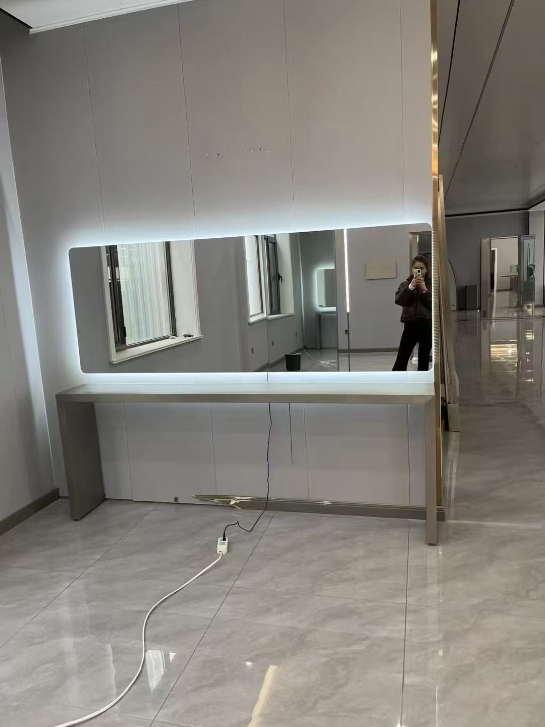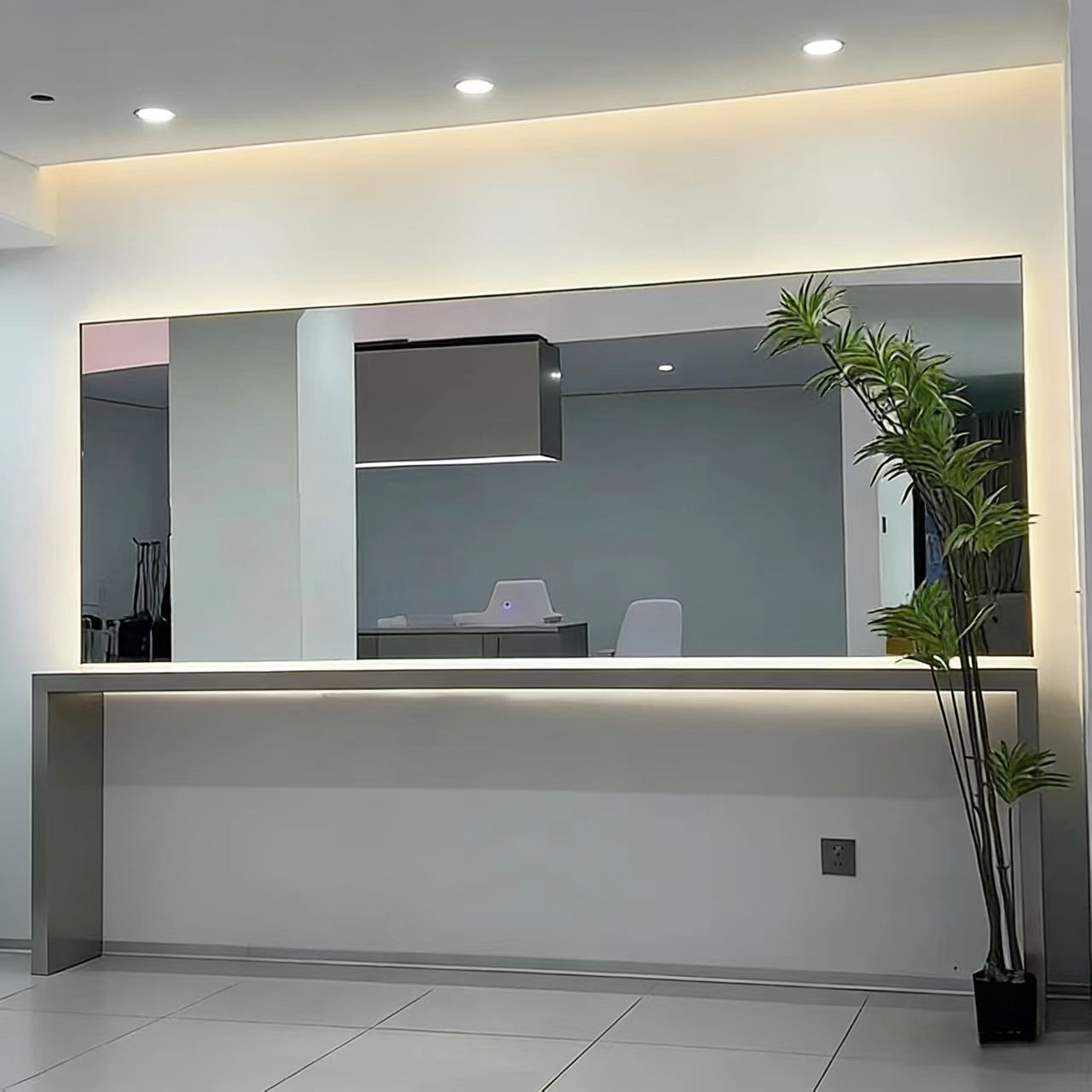 China factory,Free shipping for order over ¥50000 CNY (≈$6900)。This horizontal full-length perm & dye mirror maximizes the use of limited salon space perfectly. with built-in ambient light strips behind the mirror. The full-length mirror creates an unparalleled sense of space and three-dimensionality. this model features an upgraded brushed stainless steel tabletop with a glazed finish to prevent scratches. Choose this one for a high-quality, minimalist luxury texture!