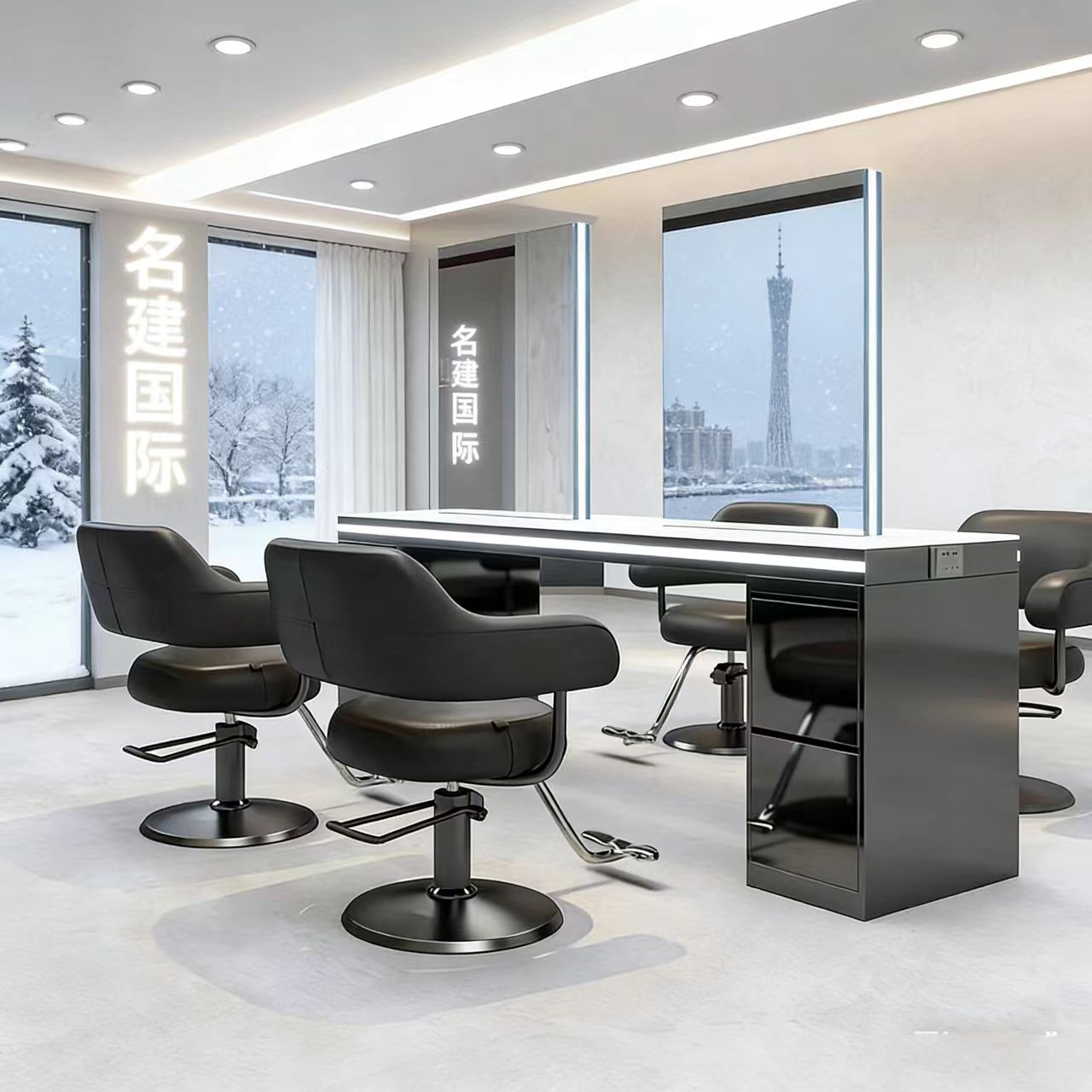 For hair salons, select the right perm & dye mirror station—prioritizing quality and fit over cost. This double-sided 4-station unit offers dimensions of 2.2m in length and 60cm in width, supported by an 80cm diameter stainless steel base. Designed for modern aesthetics, it is equipped with 360° surround ambient lighting on the mirror and accent lighting along the table edges. The marble tabletop provides a clean, hygienic surface that is easy to maintain, and the stainless steel base offers robust durability and stain resistance. A convenient storage cabinet is integrated into the center. Customizable in various specifications and colors.