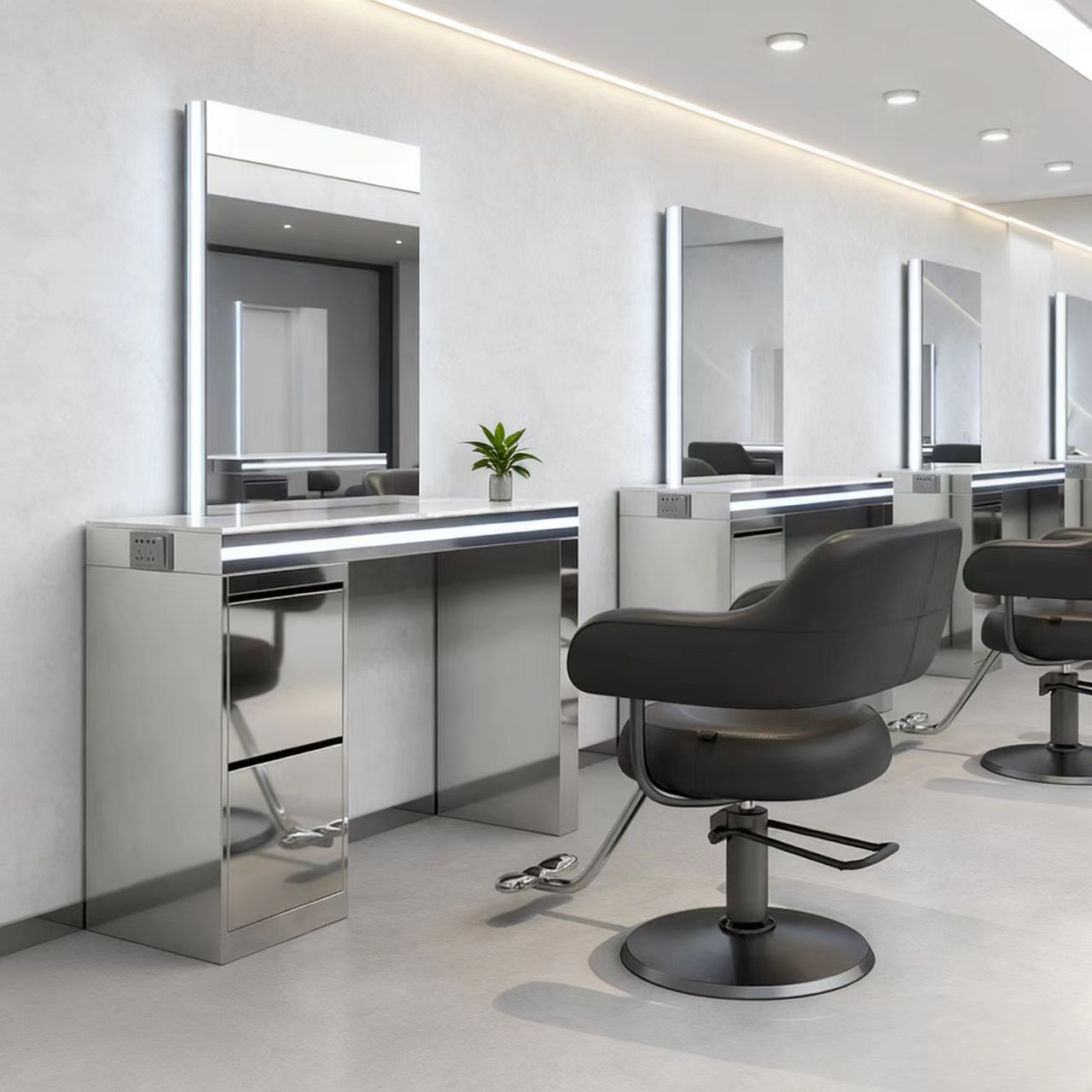 China factory,Free shipping for order over ¥50000 CNY (≈$6900) the right perm & dye mirror station—prioritizing quality and fit over cost.The marble tabletop provides a clean, hygienic surface that is easy to maintain, and the stainless steel base offers robust durability and stain resistance.