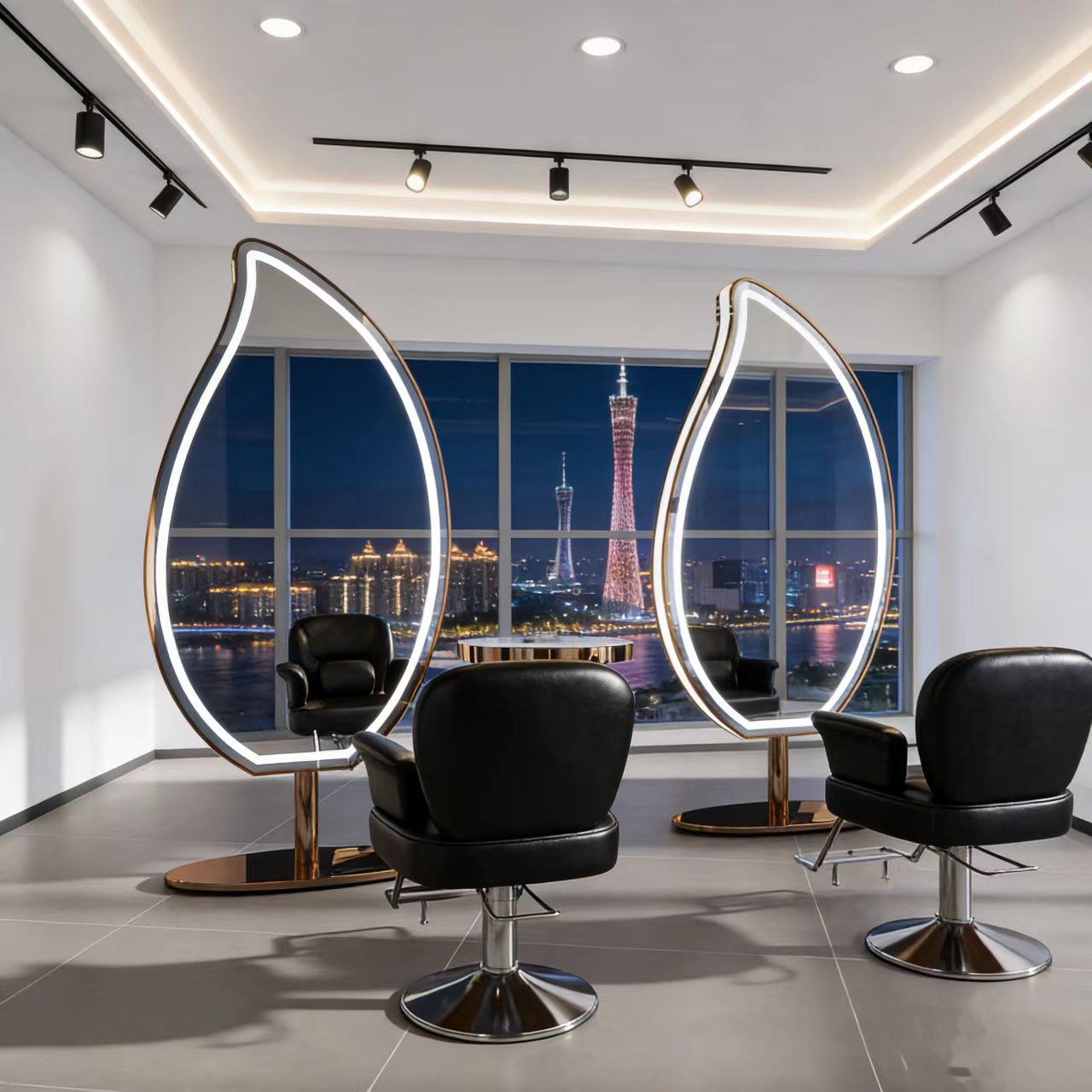 Equipped with dual LED light strips embedded in the mirror surface and side edges, the unique design salon mirror delivers soft, shadow-free illumination that’s essential for precise hair cutting, coloring, and styling. The lighting enhances the mirror’s organic leaf shape, highlighting its curved edges and lifelike contours to create a visually stunning effect. The stable, heavy-duty base ensures the mirror stays firmly grounded even in high-traffic…